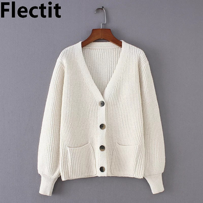 Flectit Cozy Ribbed Knit Cardigan Women V-neck Front Pocket Button Down Dropped Long Sleeve Korean Casual Chic Winter Tops *